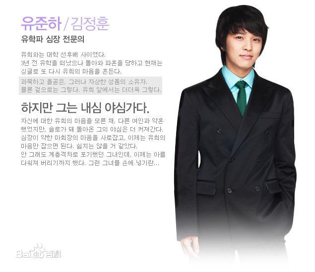 刘俊河介绍:30岁,海归派心脏科主治医生。他是幼熙大学时期的学长,3年前到国外留学,回国后遭到了女友的悔婚。现在又变为独身的他再次令幼熙心动不已。虽然他沉默寡言,但是却有非常的细心周到。当然这只是外表而已,他的这种表像在幼熙的面前更是发挥得淋漓尽致。而他的内心却充满了野心,他是在不知道幼熙喜欢自己的情况下与其他女人订婚的,现在又一次变回单身的他野心更大了。已经获得了心脏不好的马会长的信任,剩下的就是抓住幼熙的心了,但是这似乎不太容易。本来以为身份地位的差异而打算放弃幼熙的,可是她现在变得太漂亮了,令他无法放手。