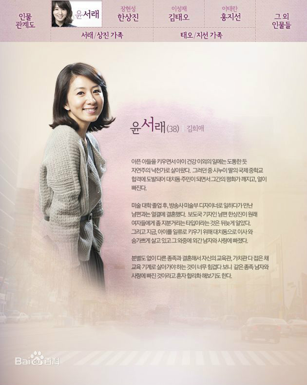 尹西莱介绍:38岁,有个体弱的儿子,除了健康之外对其他事情毫无关心的乐天派。听到小姑子的女儿考上国际中学的消息后,咬紧牙关搬到大峙洞,平静的生活从此打破。毕业美院后在电视台做美术设计,那时候遇到了现在的丈夫。婚后才知道当新闻部记者的丈夫有沾花惹草的习惯。为了孩子的教育搬到大峙洞,过着忙碌的生活,期间与已婚男人陷入了爱情。